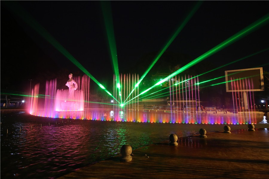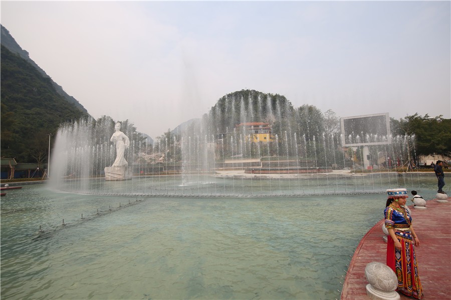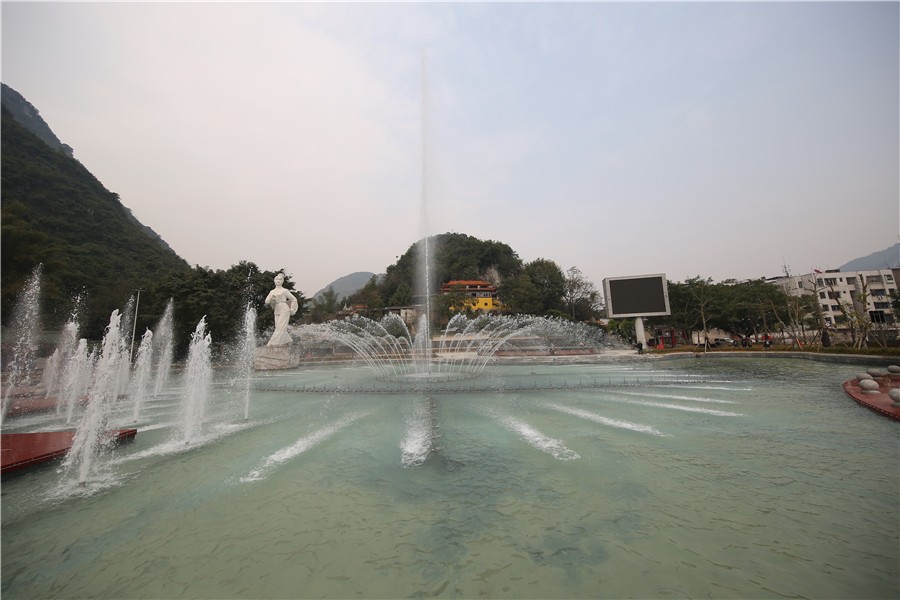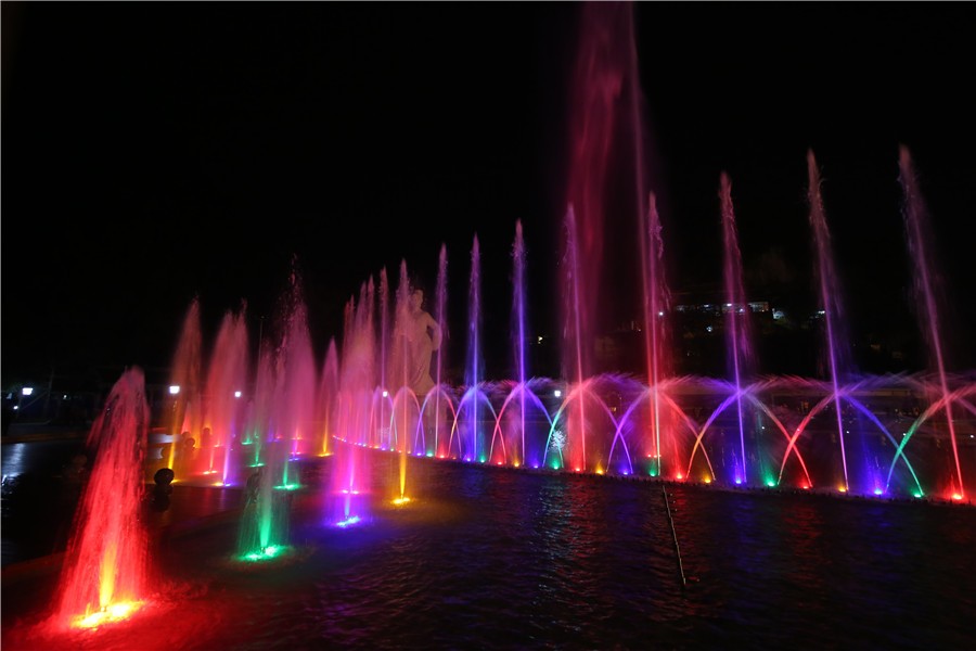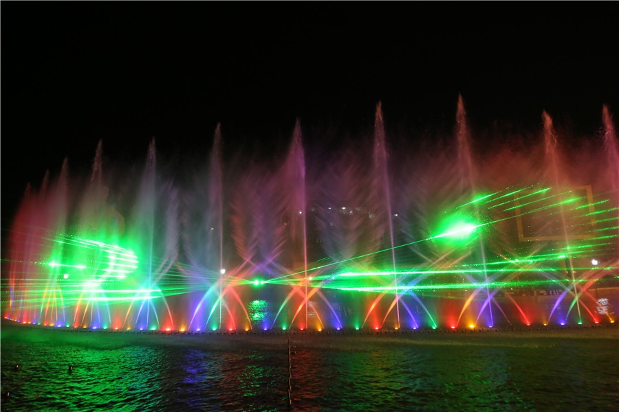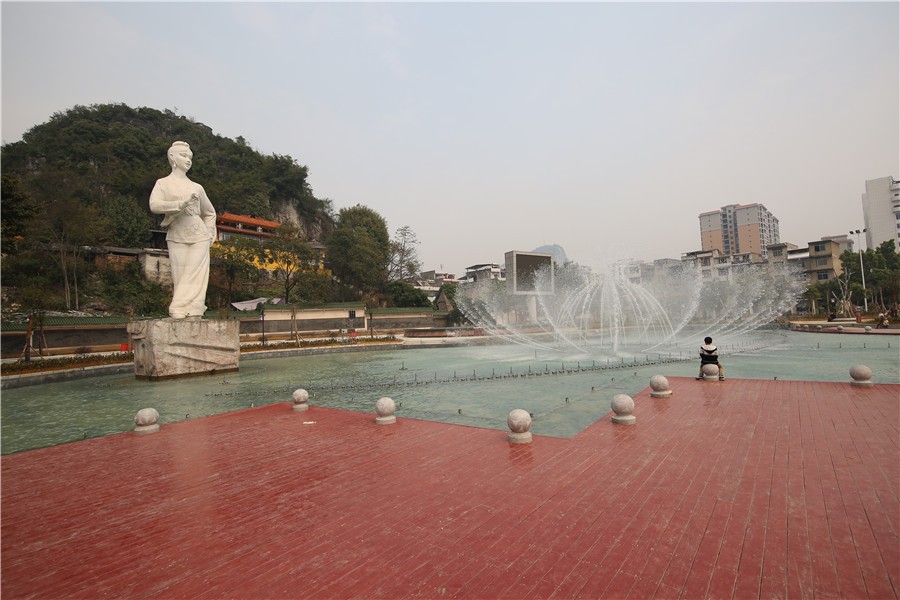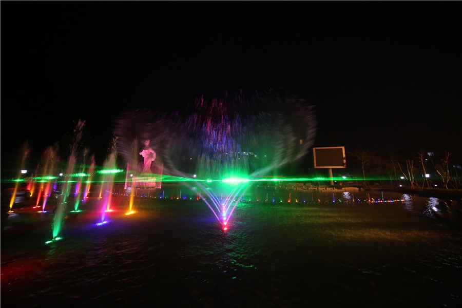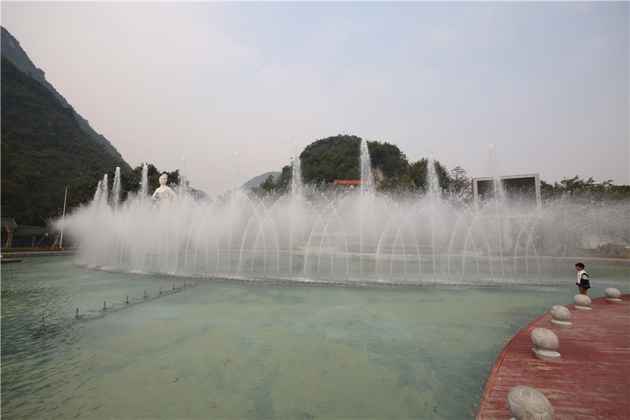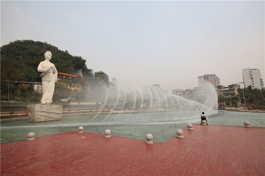 宜州市宜山公園劉三姐音樂噴泉設(shè)備安裝工程:劉三姐廣場(chǎng)位于廣西河池市宜州市北環(huán)路段,距市中心1千米。中心噴泉西北端為一座13米高的純漢白玉劉三姐塑像;噴池呈中國地圖形狀,面積2133平方米。晚間,水下的417盞彩燈,在優(yōu)雅動(dòng)聽的劉三姐歌唱聲中有節(jié)奏地噴射出色彩斑斕、千變?nèi)f化的水霧和水花。是集觀光、娛樂、歌圩、民族文化活動(dòng)于一體的旅游景點(diǎn)。